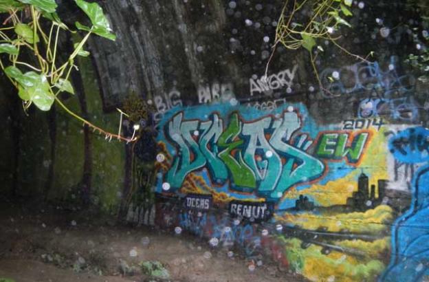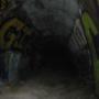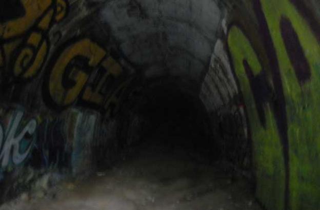 Standing at the mouth of the tunnel, I am inclined to agree with him. There is something very wrong with this place. I wade into the pool of foaming water and clamber up into the tunnel. In the dim light, the graffiti on the arching walls is a gloomy riot of color—like a clown that’s been face down in the gutter for a few days. I hesitantly make my way to the back of the tunnel, which is choked with dirt, wishing I had brought a flashlight. It is very dark back here. When I hazard a glance back out the tunnel, the skull-shaped entrance looks disproportionately far away and I fight the urge to escape.