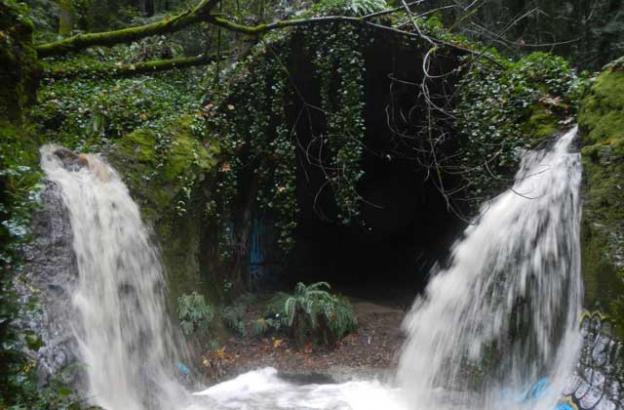 It is pouring rain. I am standing before a gaping black tunnel below the summit of the Santa Cruz Mountains. Two gushing tongues of runoff lash the grim gateway. They spill from the structure’s shoulders into a foaming pool of deep, muddy water and swirl. Long tendrils of vine hang from its brow. The inside of the tunnel’s mouth is luridly painted with a dark carnival of graffiti. I peer into it, trying to see where it leads, but there is only blackness.