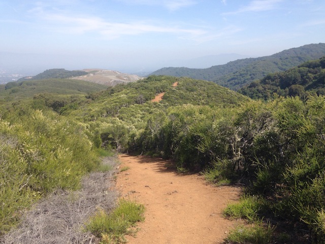 At Vista Point, turn left onto the Quarry Trail*. Climbing 800 feet in just 1.1 mile, this track ascends from Vista Point to Black Mountain Trail, switchbacking out of the trees to reach a chamise-covered ridge (a particular kind of chaparral known as chamissal) and beautiful views. When the chamise blooms in the spring the trail is a tunnel of sun-brighted white flowers. Butterflies and bees will abound. As the trail climbs the views expand, with folding green mountainsides falling away in stages to the cityscape below. Towards the top of the climb the namesake rock quarry is visible, reminding us of where, exactly, we source all those landscaping rocks.